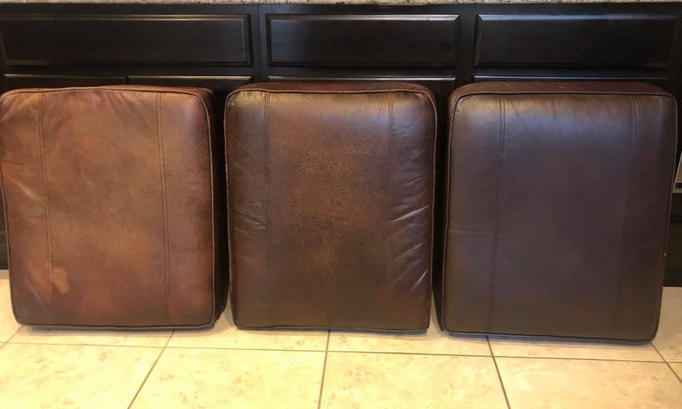 These chair seat cushions have been restored with the Dark Brown Renew Balm and show the difference with one coat (middle cushion), two coats (right cushion) and the original (left cushion)